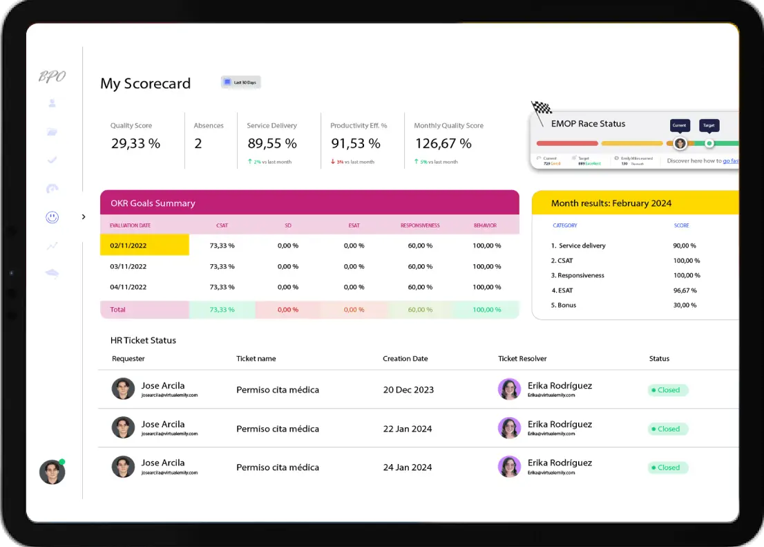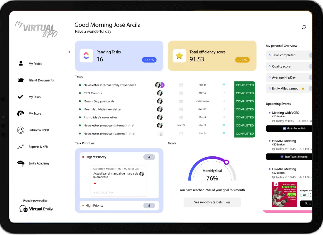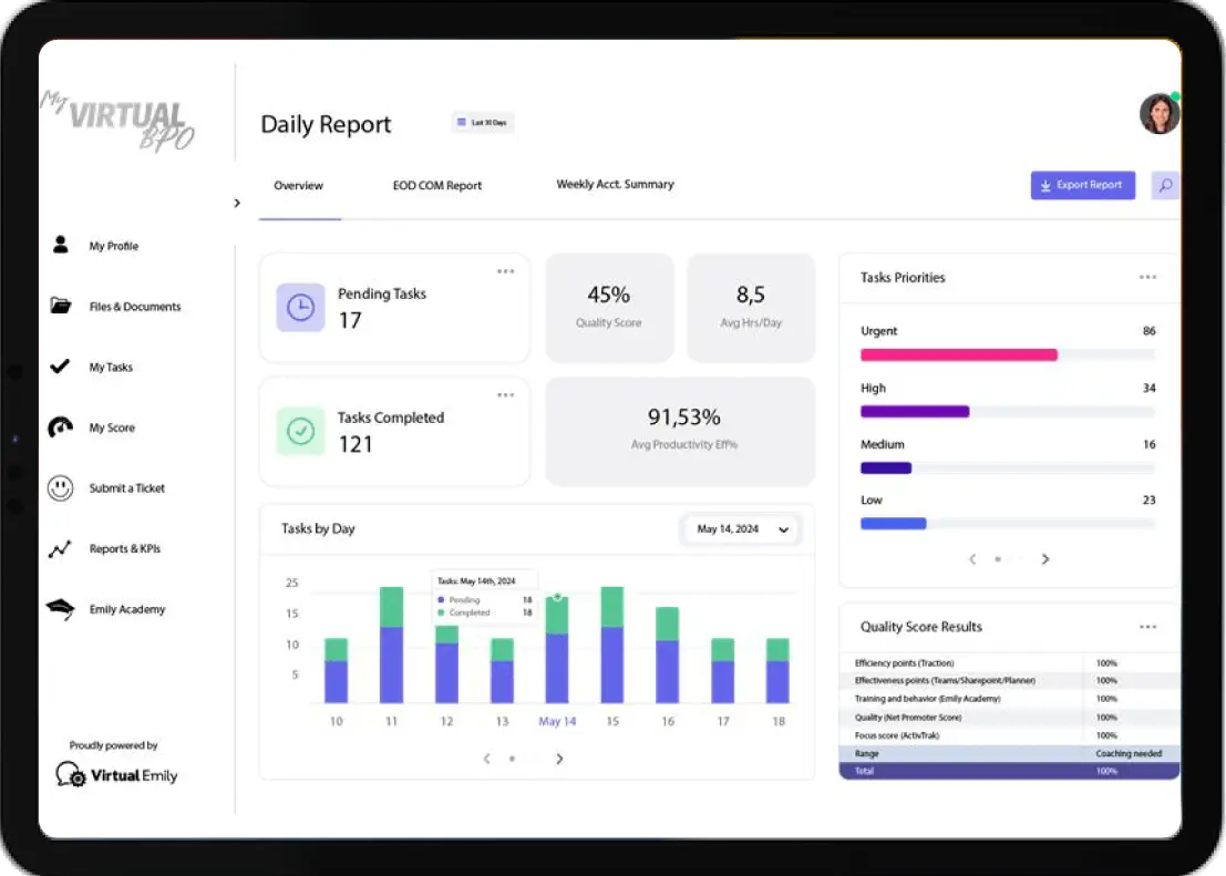 Our process maping is so complete that it allows you to see different dashboards of task tracking, performance, and training of your remote employee, aka Emily.